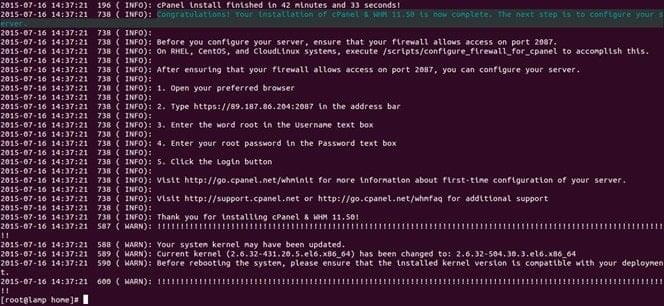 يقوم هذا الأمر بتغيير دليل العمل الحالي إلى / home ، ويقوم بتنزيل أحدث اصدار من cPanel وينفذ البرنامج للتثبيت.